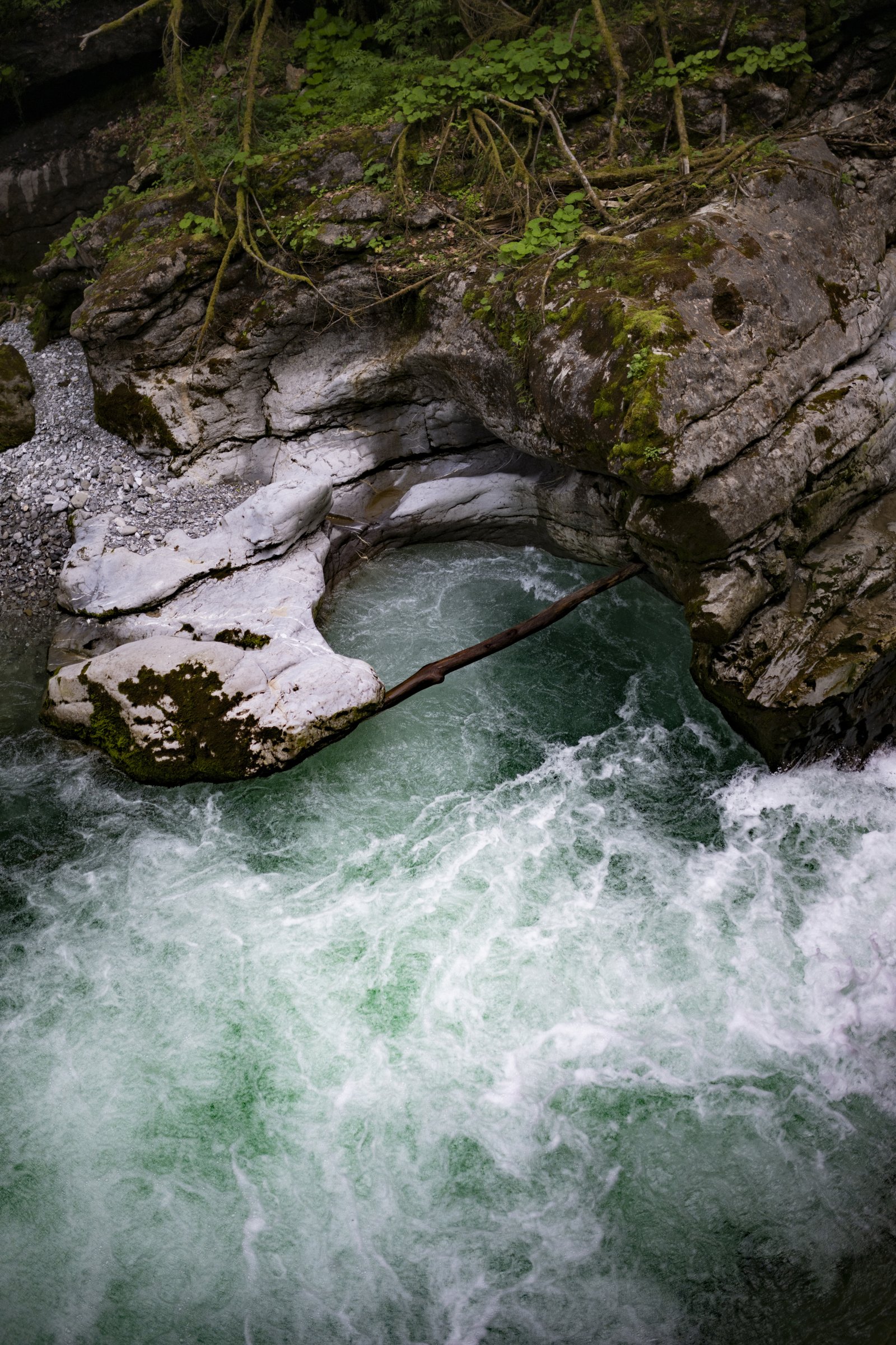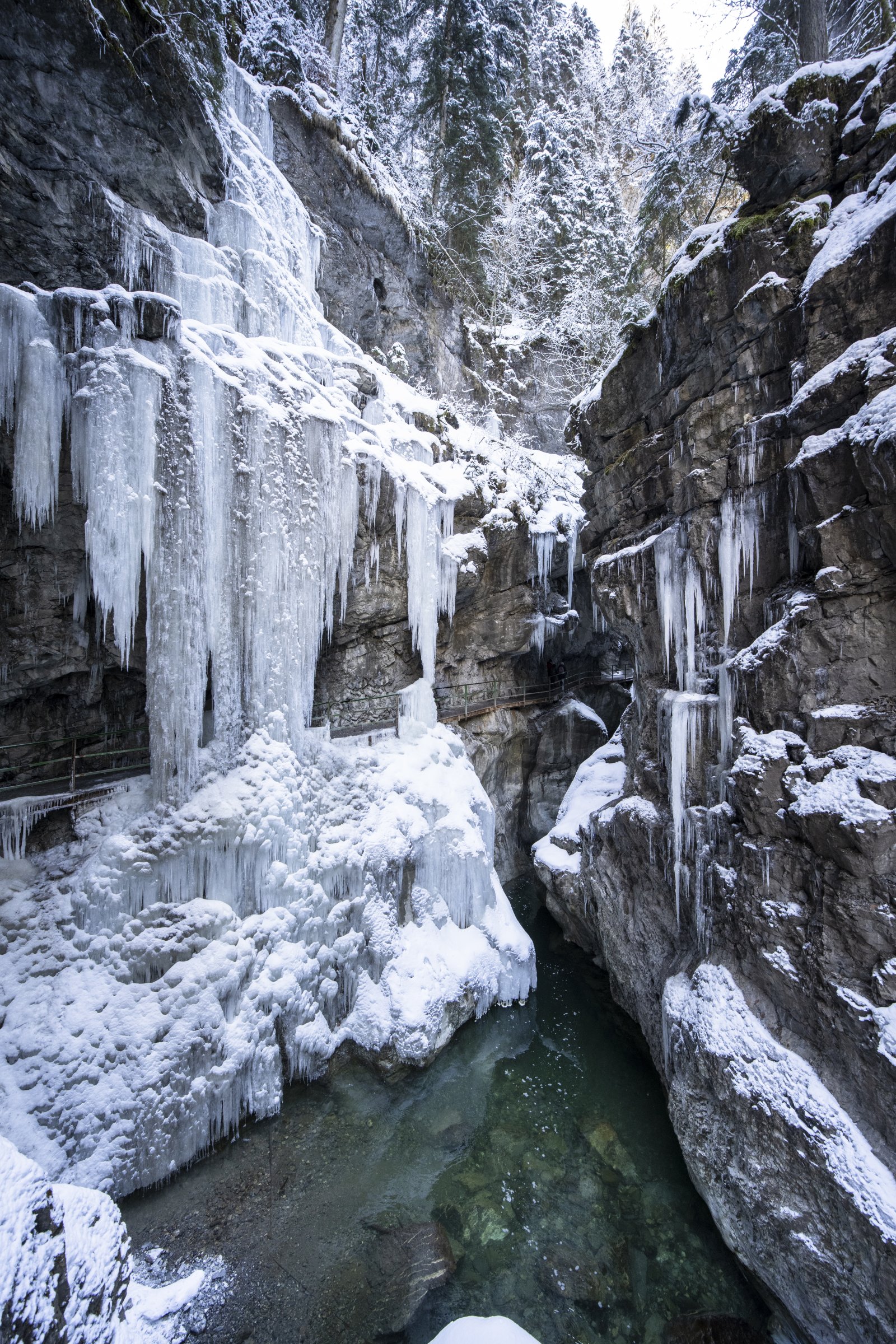 Manche der düsteren Klammwände haben noch nie die Sonne gesehnen. Tiefgrüne Moose und zierliche Farne lieben die Feuchte und einige unerschrockene Fichtenbäume haben sich kühn auf kleinsten Felsvorsprüngen angesiedelt.