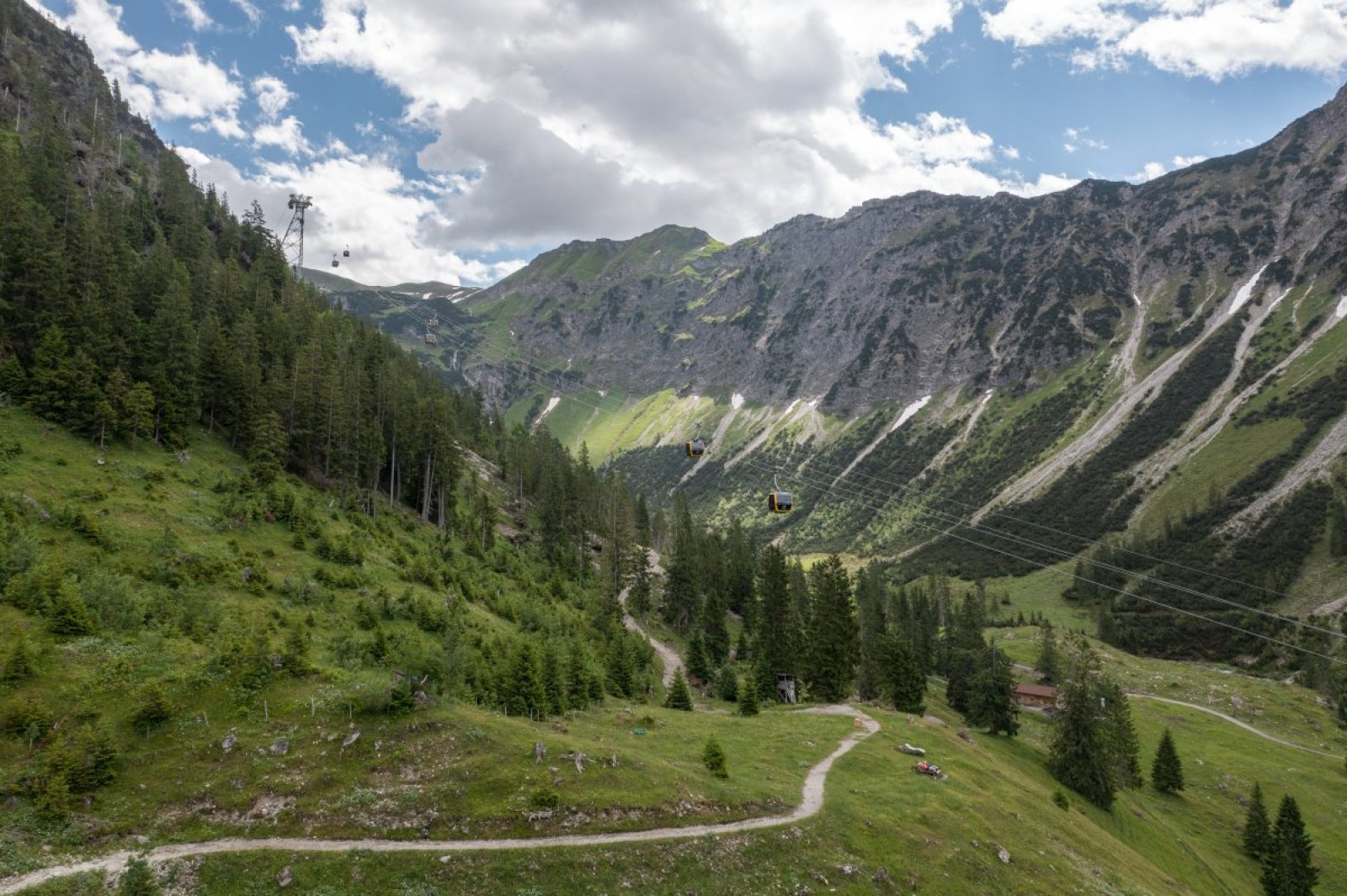 Von der Nebelhornbahn Talstation führt der Hüttenanstieg zunächst zur Skisprung Arena. Hier findet alljährlich mit dem Auftaktspringen der Vierschanzentournee eine der traditionellsten und bekanntesten Veranstaltungen der alljährlichen Skisprungsaison statt. Im Stadion links haltend, beginnt etwas oberhalb des Stadions der Anstieg über das Faltenbachtobel. Hier geht’s es abseits der Fahrstraße entlang des beindruckenden, tosenden Bachverlaufs über einige Alubrücken und Treppen anständig nach oben. Die besser ausgebaute Variante führt am Eingang des Faltenbachtobels weiter über die Fahrstraße zur Seealpe.