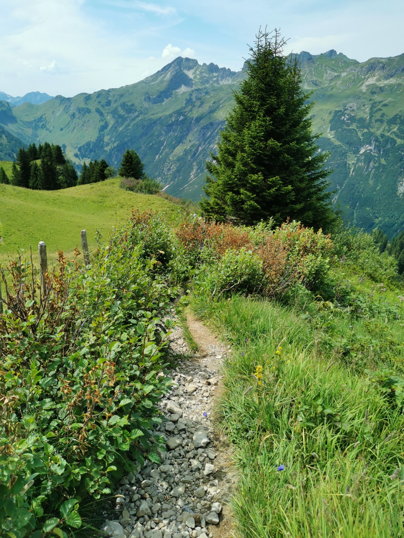 Wir folgen dem Bergpfad hinauf Richtung Rappenseehütte. Nach einiger Zeit steilen, aber Dank vieler Bäume überwiegend schattigen Bergsteigens, erreichen wir die Weideflächen der Rappenalpe. Schon bald passieren wir die dazugehörige Alphütte. Der Anstieg weiter hinauf zum Muskopfsattel, der teilweise über steile - dafür aber etwas breiter - angelegte Alpwege (Verbindungswege für die Rinder) führt, wird sonniger und auch schweißtreibender.