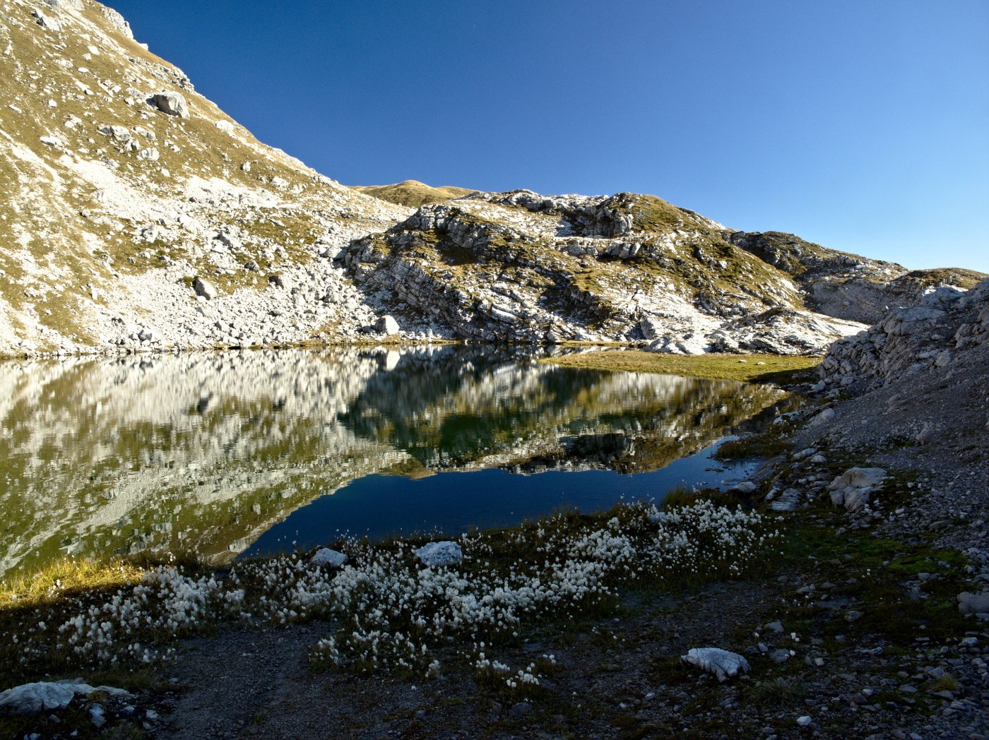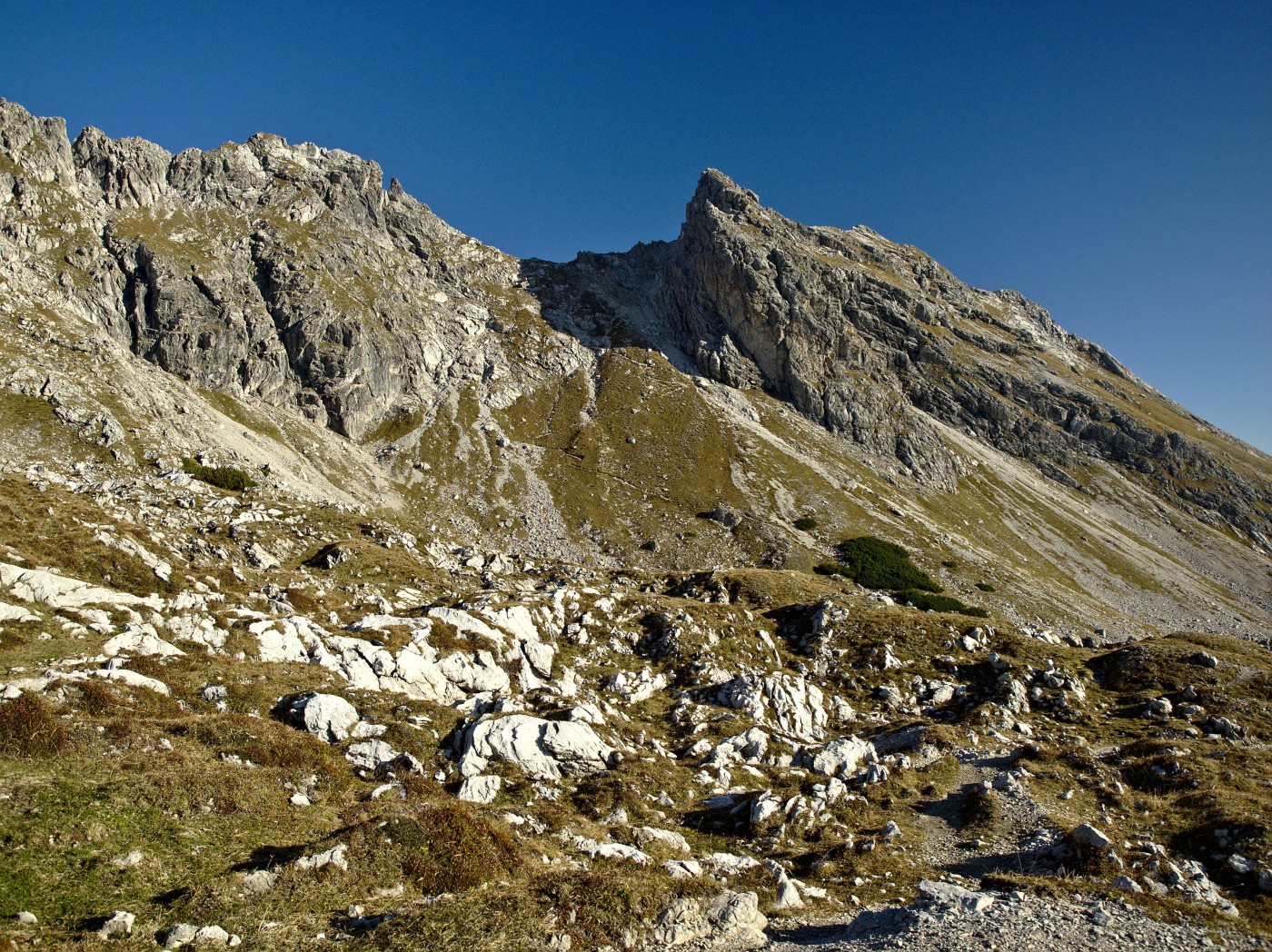 Von der Bergstation der Nebelhornbahn führt der Weg zunächst über eine Hochmulde zum gegenüberliegenden Hang, um hier in wenigen Kehren auf das Koblat aufzusteigen. Auf dem Höhenplateau angekommen verklingt der Bergbahnrummel. Nun geht es unterhalb der felsig-imposanten Wengenköpfe oft recht flach, mal leicht bergab oder bergauf über das ausgedehnte, spärlich begrünte Karstgelände bis zum Koblatsee. Dabei bietet der Höhenweg ein faszinierendes Bergpanorama vom Hochvogel bis hin zur Höfats.