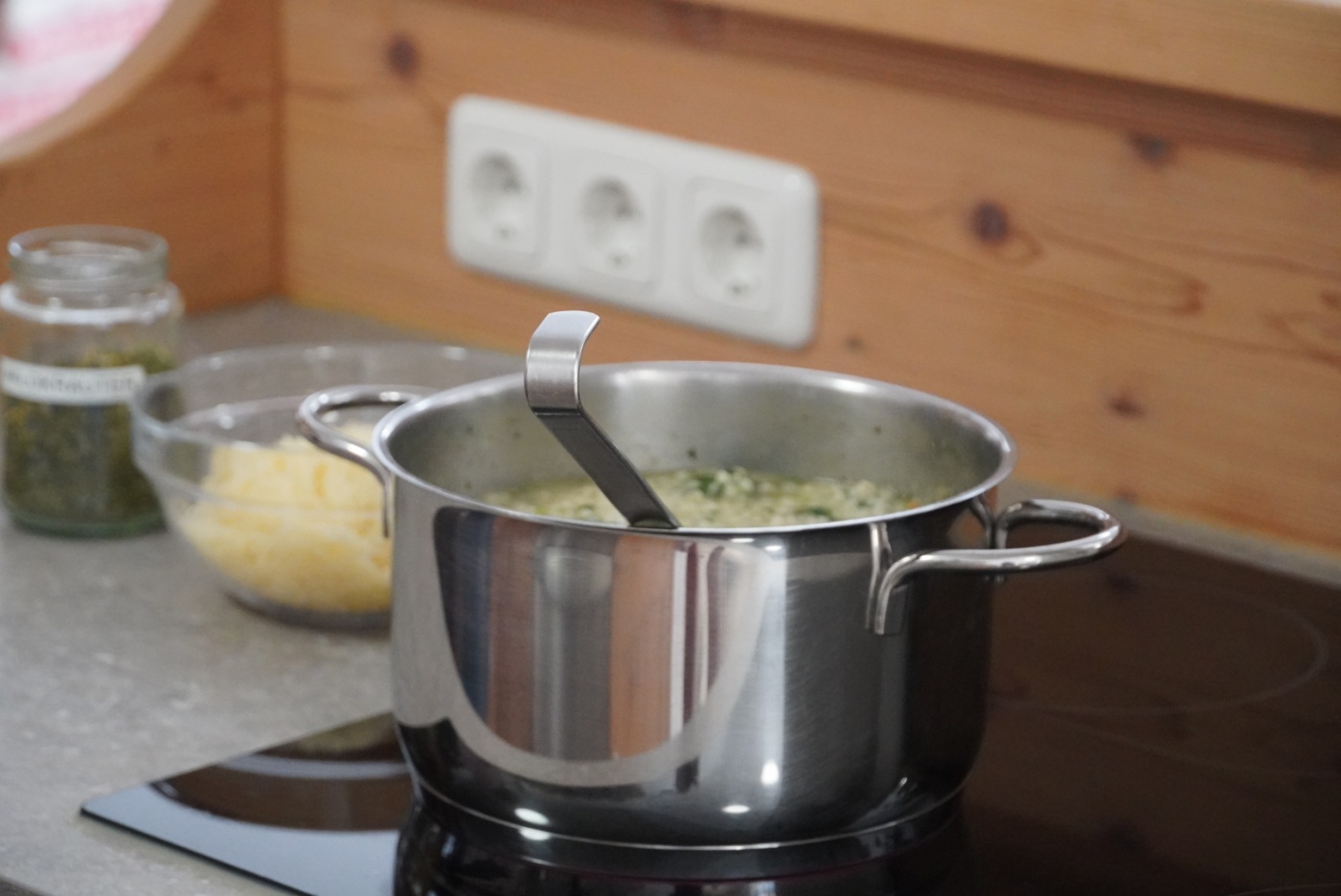 Den grob gehackten oder gefrorenen Spinat hinzufügen und weitere 10 Minuten mitgaren. Dabei regelmäßig rühren, damit nichts am Topfboden ansetzt.