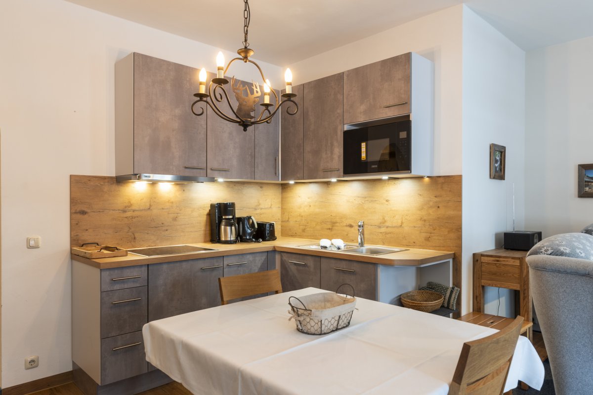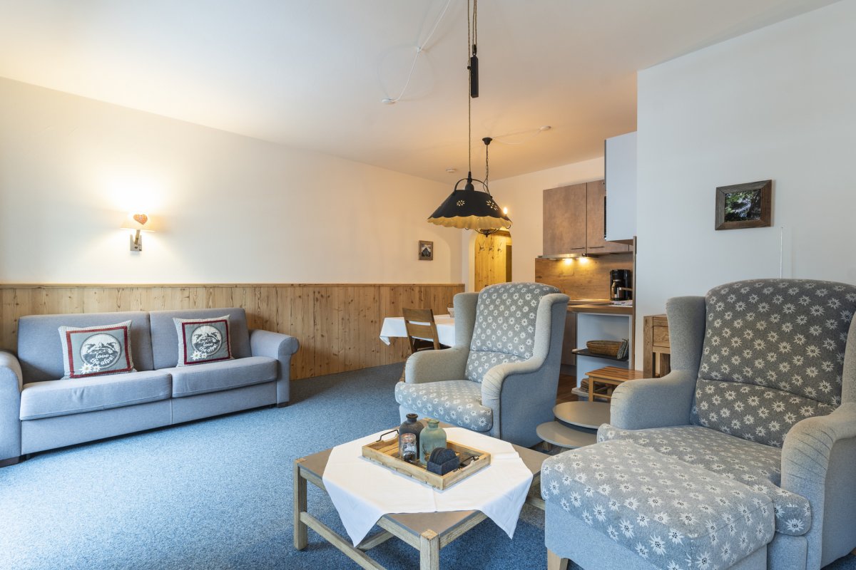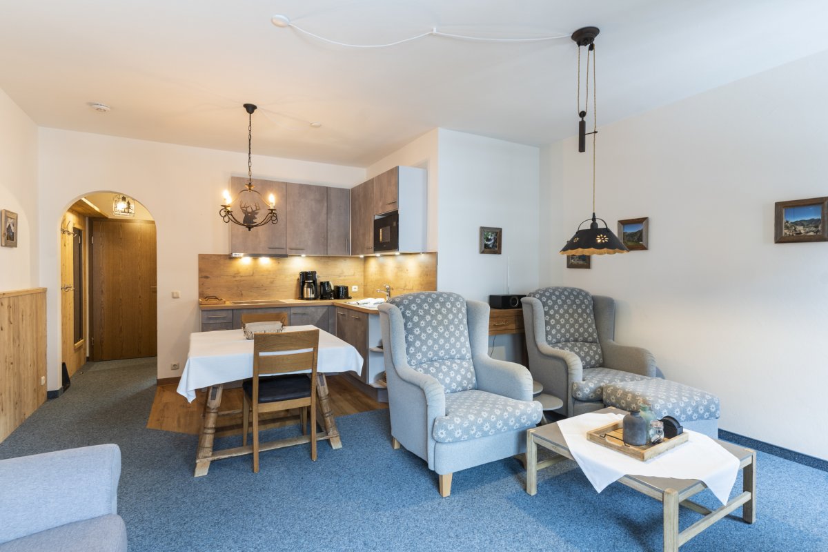 Wohnraum mit Schlafcouch (Kaltschaummatratze 160x200 cm), Essplatz, Küchenzeile mit Mikrowelle, Schlafzimmer mit Doppelbett, Badezimmer mit Dusche und WC, Südwestbalkon, Radio, Kabel-TV, WLAN, Tiefgarage, die geöffneten Bergbahnen können von Mai bis Oktober kostenlos vor Ort hinzugebucht und beliebig oft genutzt werden