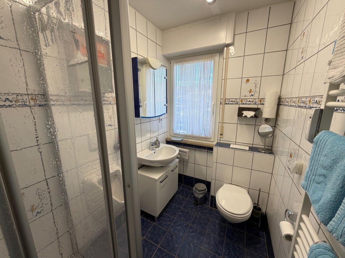 Tageslichtbad mit Dusche, Waschbecken, WC, Handtuchwärmer, Föhn.
