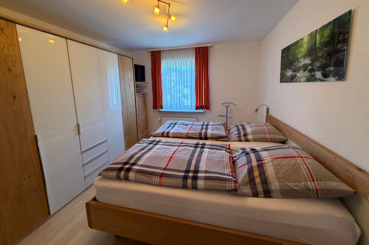Schlafzimmer mit Doppelbett und großem Kleiderschrank, TV