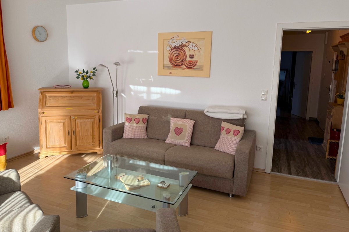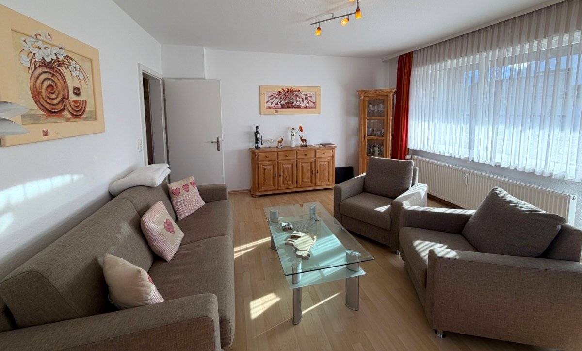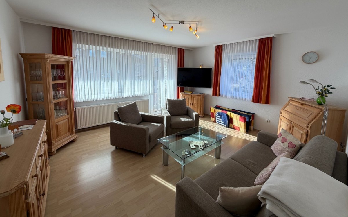 Gemütliches und helles Wohnzimmer mit Sofa und Sesseln, großem Flach-TV und Süd-Balkon