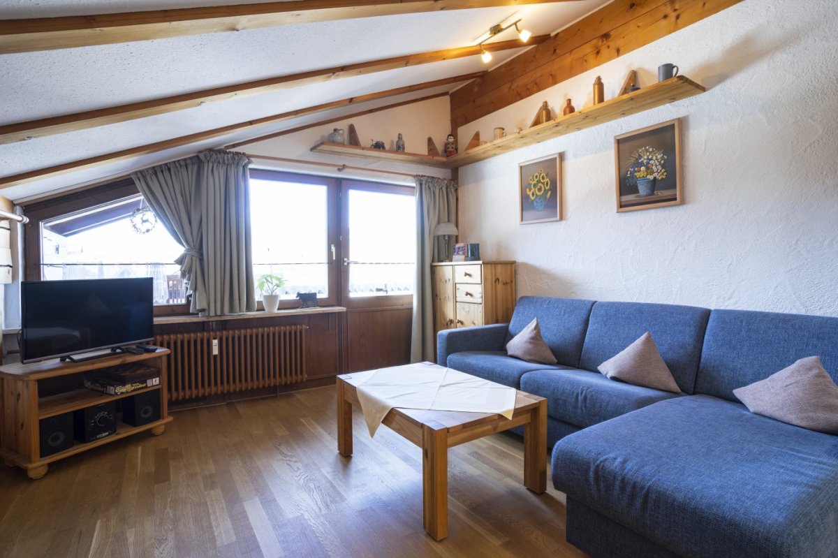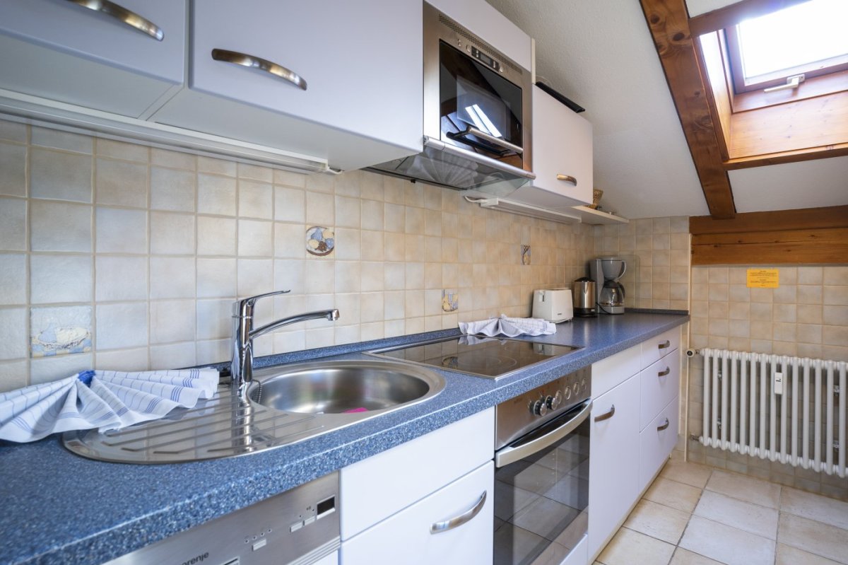 Großer Wohnraum mit Schlafcouch (Kaltschaummatratze 120x200 cm) und gemütlicher Essecke, zusätzliches Maisonettenbett (140x200 cm), separate Küche mit Spülmaschine, Mikrowelle und Backofen, Schlafzimmer mit Doppelbett, Badezimmer mit Dusche und WC, Flur mit Garderobe, Stereoanlage mit CD- und DVD-Player, WLAN, Kabel-TV, Westbalkon, Tiefgaragenplatz, Waschmaschine und Trockner im Keller