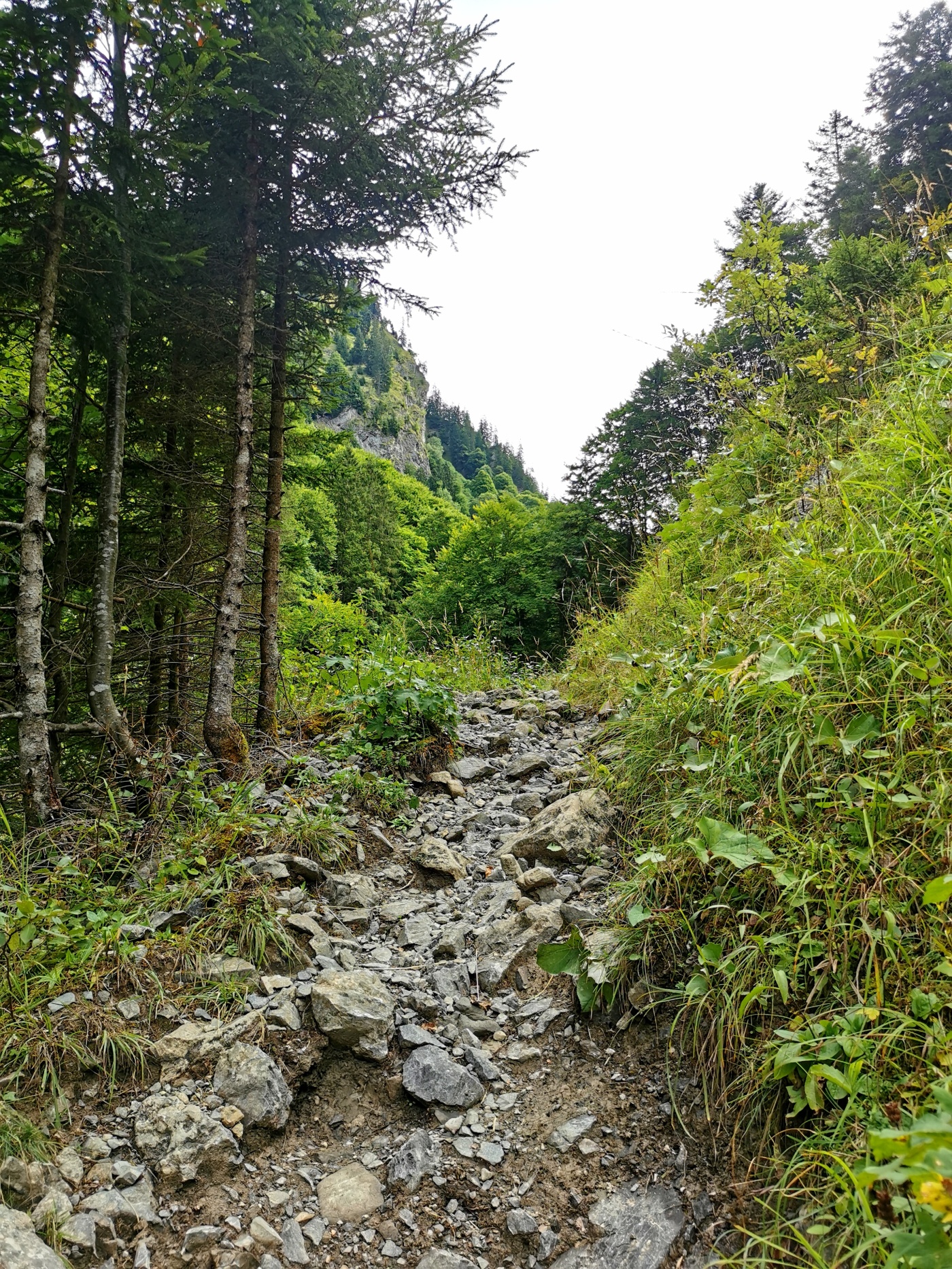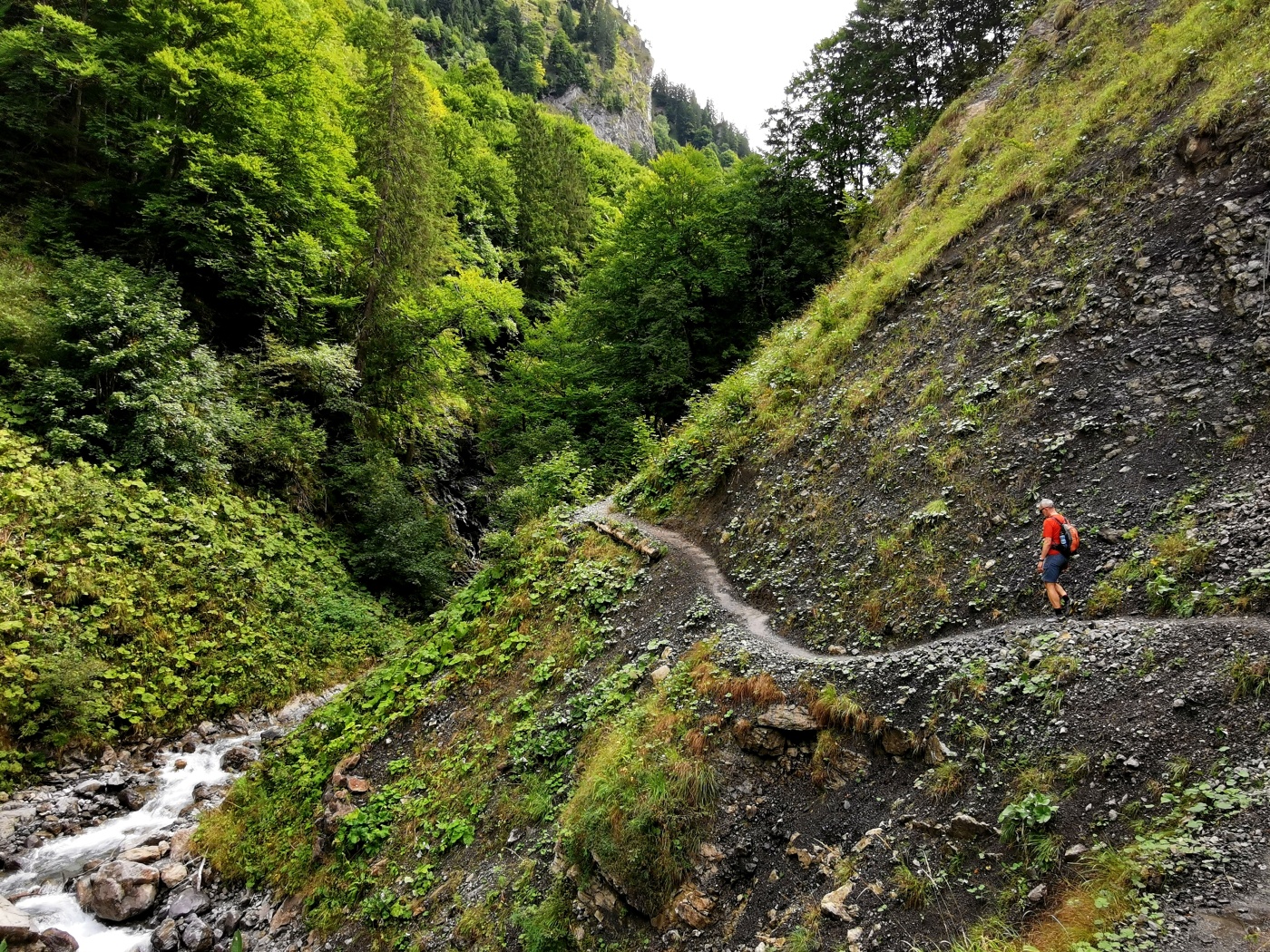 führt der Anstieg ins Traufbachtal immer tiefer in eine wilde und beeindruckende Schlucht. Im Anschluss an einen kleinen Steg, der über den Traufbach führt, steigt der Tobelweg zunächst steil und schroff nach oben. Bitte beachte die erhöhten Anforderungen, die für eine sichere Begehung des Weges ab hier zu erfüllen sind! Im mittleren Teil der Schlucht wird der Weg flacher. Hier führt der Anstieg auf halber Höhe oberhalb des Baches, inmitten des wilden und ursprünglichen Tobel, weiter nach oben.