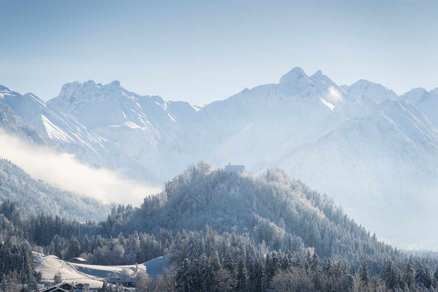 Zurück auf dem Rundweg, geht es nun entlang des Höhenrückens überwinterliche Lichtungen mit idyllischen Ausblicken auf Reichenbach und das Bergpanorama auf der gegenüberliegenden Talseite. Allmählich führt der Weg bewaldet über meist leichte Abstiege nach Widum, am Fuße des kleinen Berges. Hier empfiehlt sich ein kurzer Abstecher zur Schöllanger Burgkirche!